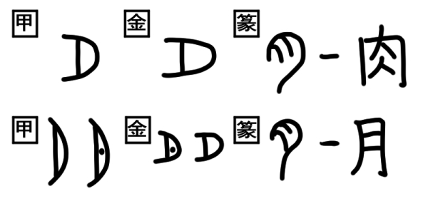 起源を辿ると、紀元前1500年前の甲骨文字や金文、篆文といった今の漢字のルーツが存在していて、この身体を表す部位に使われる漢字の部首である『月』と、夜空に浮かぶ『月』は成り立ちが異なります。